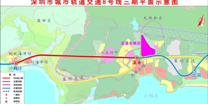 地铁8号线三期起于小梅沙站,止于溪涌站,全长3.69公里,共设溪涌站1座及1个区间,并同步建设1个溪涌车辆基地。线路开通后,将与2&8号线贯通运营,形成一条横贯南山、福田、罗湖、盐田和大鹏新区的轨道交通骨干线路。